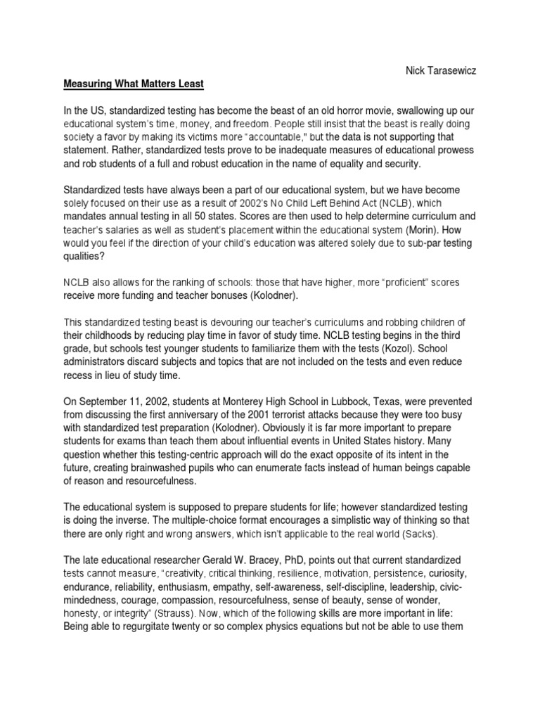 The case against standardized testing. The case against ... from imgv2-2-f.scribdassets.com See this essay paper instructions, drama,. Many people feel that no child left behind and the iep program are working just fine and do not need modified. There are many formal websites, articles and scholarly essays written about this topic posted and printed all.