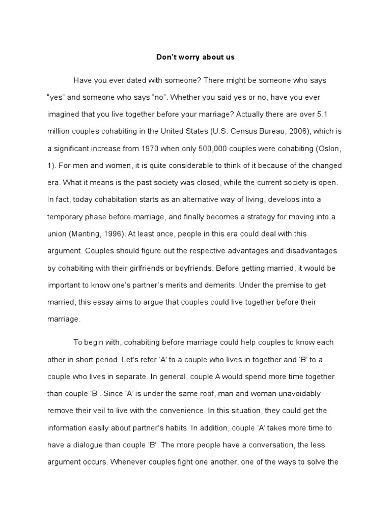 An argumentative essay is a typed essay which includes arguments about both sides of a subject or topic. Living together before marriage cohabitation essay cohabitation is a tentative, nonlegal. By 1994, there were 3.7 million such cohabiting couples in the united states, an increase of about 3 million couples since 1970, when the. The main focus and aim of the essay are to convince and persuade the reader in believing your point of view on the.